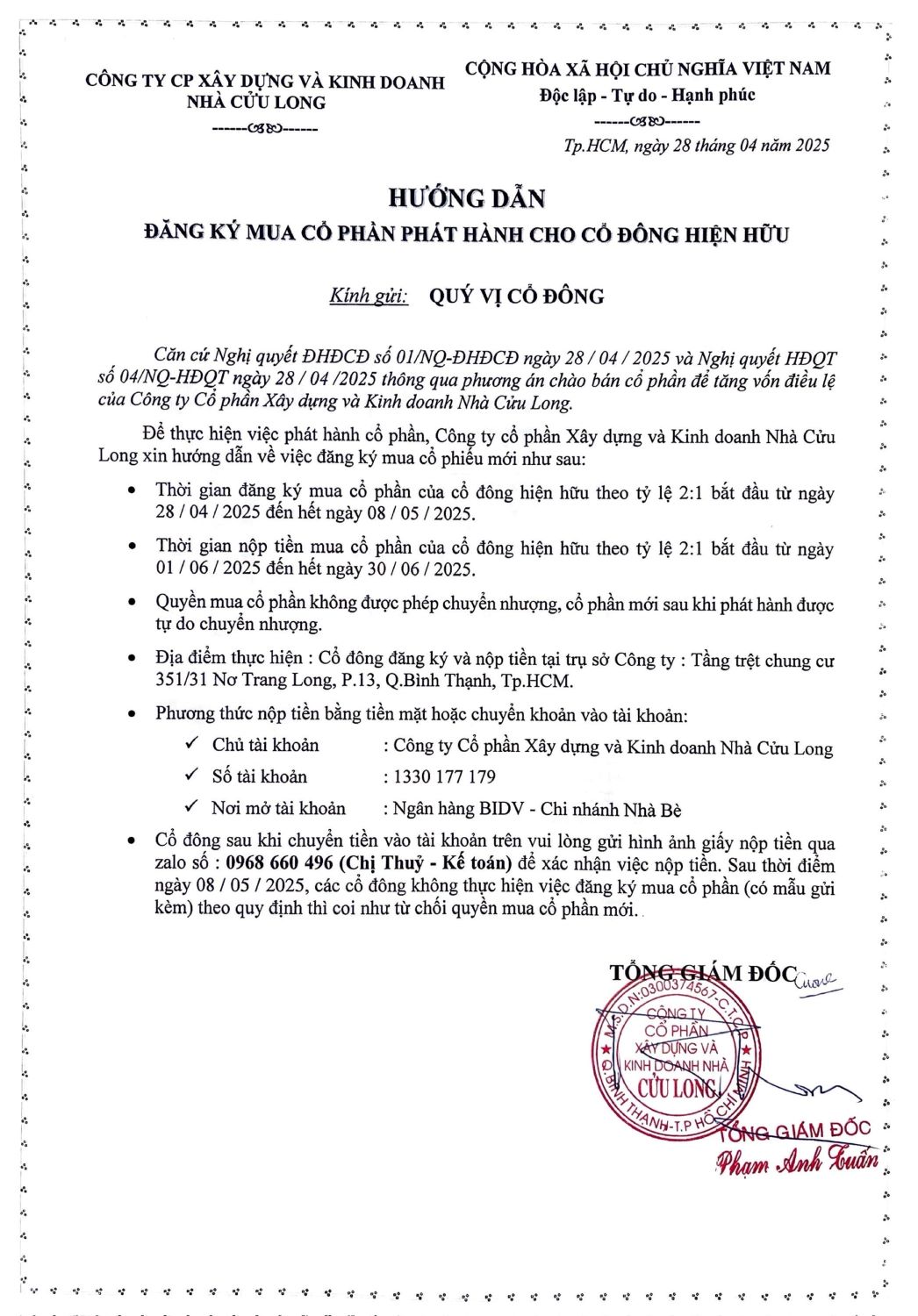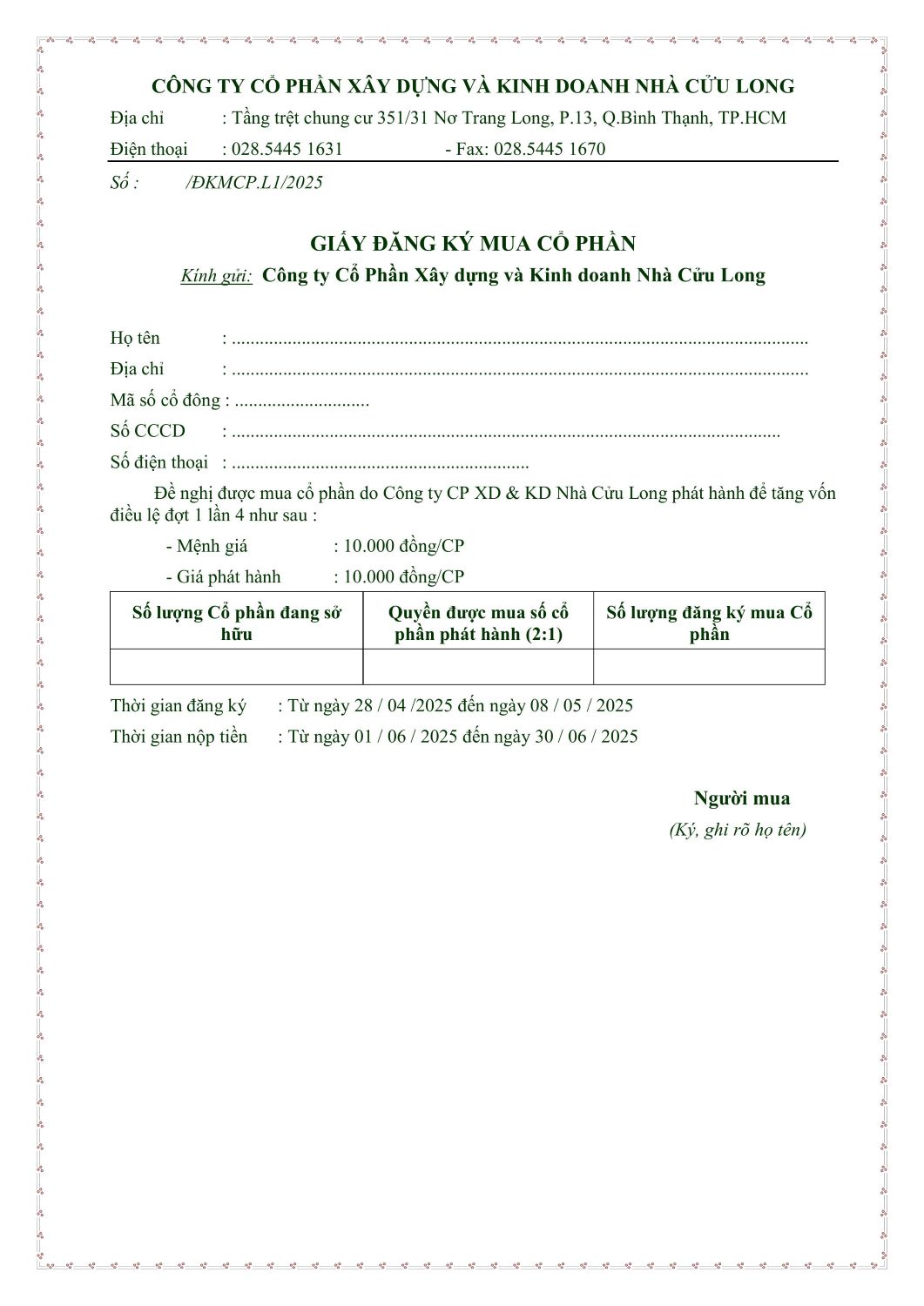 HƯỚNG DẪN ĐĂNG KÝ VÀ GIẤY ĐĂNG KÝ MUA CỔ PHẦN PHÁT HÀNH ĐỂ TĂNG VỐN ĐIỀU LỆ CHO CÁC CỔ ĐÔNG HIỆN HỮU CỦA CÔNG TY