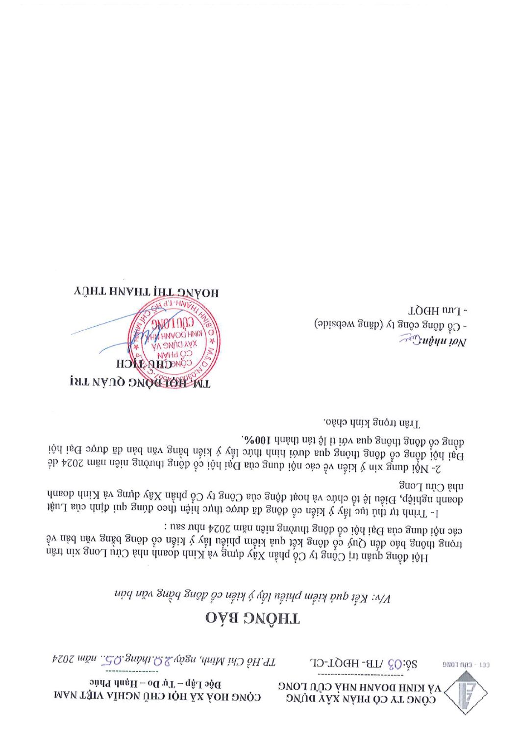 V/v : Kết quả kiểm phiếu lấy ý kiến cổ đông bằng văn bản